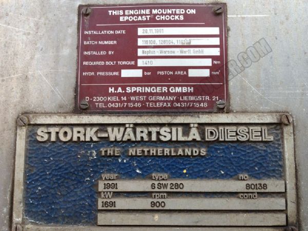 Stork Wartsila 6SW 280 Main Engine Available. Engine Year of Build is 1991 Engine is 1691 KW @ 900 RPM Engine Came to Turkey in %100 Running condition.
