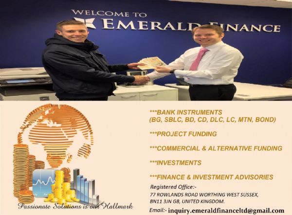 | Details : | We are project funder as well as financial lender. We have BG/SBLC specifically for BUY/LEASE at a leasing price of 4%+1% of face value Issuance by HSBC London, Barclays Bank and many other 25 top AA rated Banks. We also secure funding to facilitate and enhance your business and projects. Also We are into the provision of short term and long term business/personal loans for both small and large scale business funds.