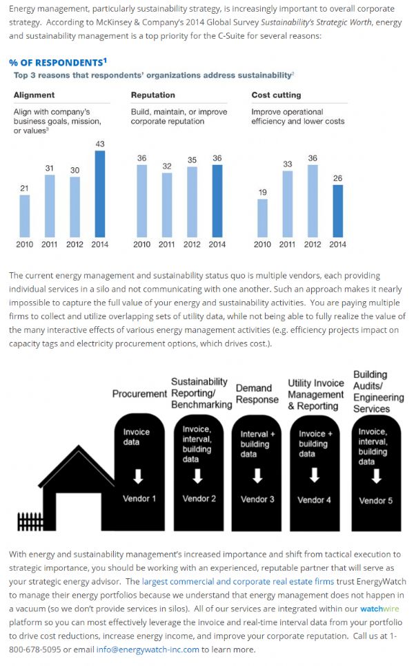 | Details : | EnergyWatch is an established energy consulting firm with a startup mentality. Founded in 2000, EnergyWatch helps our clients minimize energy cost, consumption and emissions. We maximize energy income through utility invoice analytics, energy procurement, utility budgeting and reporting, and real-time consumption analytics.