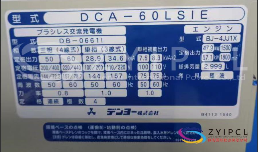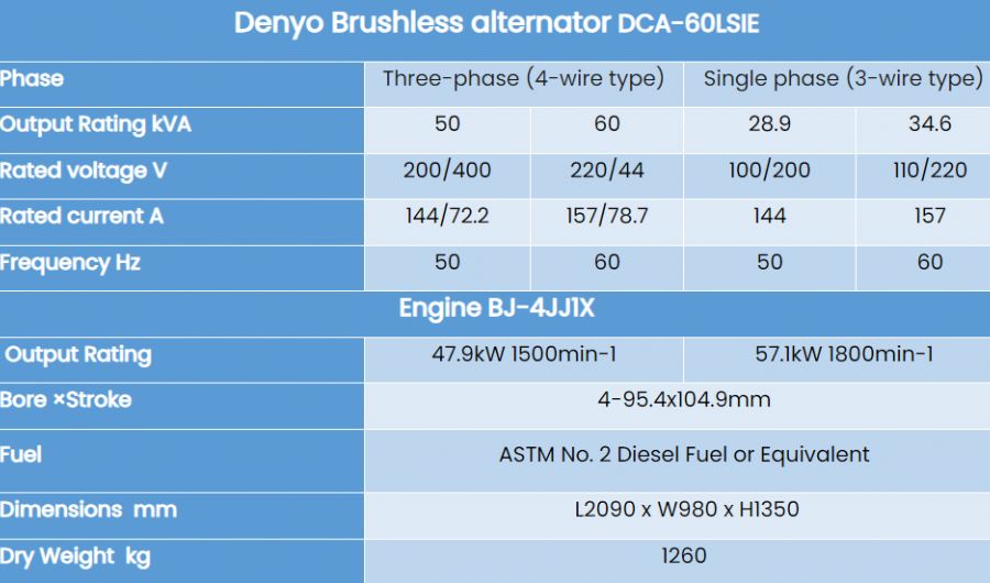 The Denyo DCA-60LSIE is a natural gas generator that provides 50 kVA of power at 50 Hz and 60 kVA at 60 Hz. It is designed for efficiency, reliability, and clean operation, making it suitable for a range of applications including backup power, commercial and industrial use, and temporary power needs.