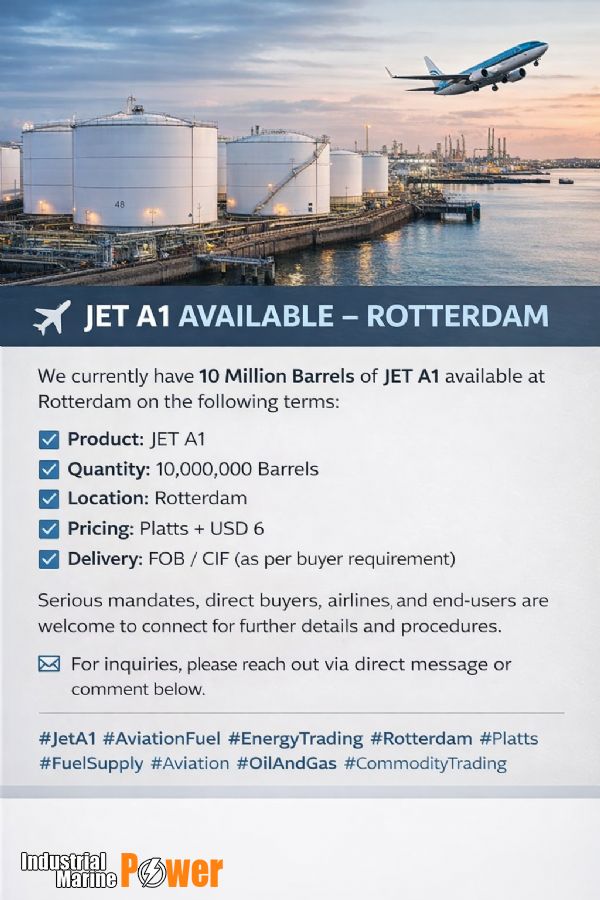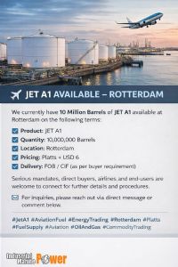 Product: JET A1 Quantity: 10,000,000 Barrels Location: Rotterdam Pricing: Platts + USD 6 Delivery: FOB / CIF (as per buyer requirement)