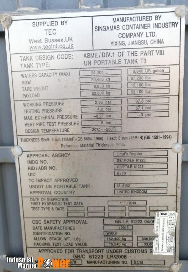 We are offering TEC 22T3 ISO Tank Containers for sale, designed for the safe storage and handling of flammable liquids in industrial, marine, and stationary installations. These UL-certified ISO tank containers are engineered for high safety standards, temperature-controlled storage, and spill protection.